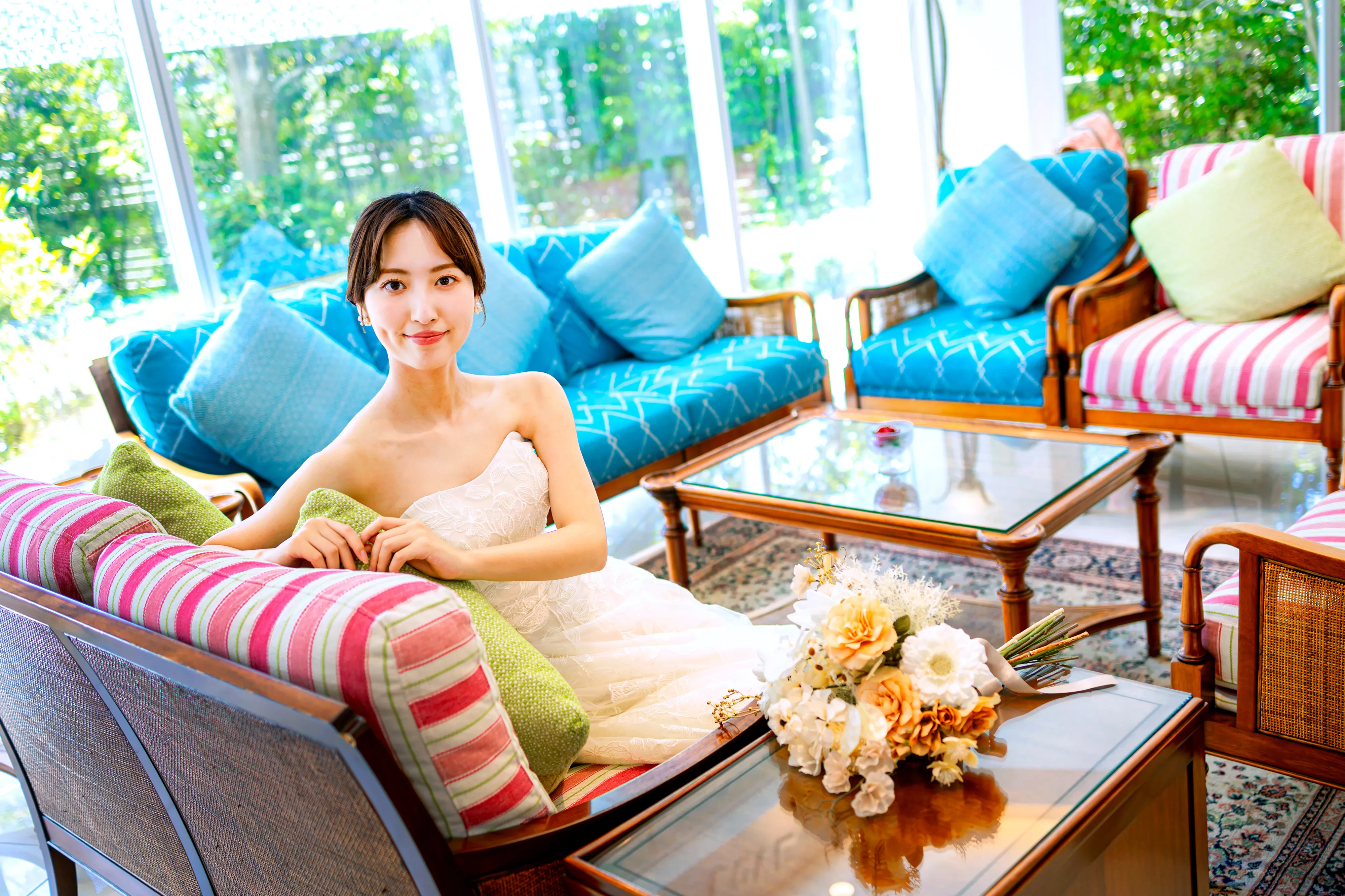 花嫁がゲストとソファに並んでおしゃべりする